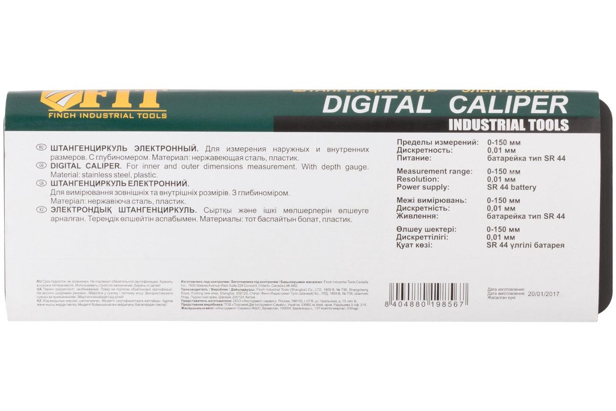 FIT 19856 – металлический штангенциркуль с электронным отсчетом. Инструмент предназначен для внутренних и наружных измерений. Корпус изготовлен из нержавеющей стали. FIT 19856 оснащен ЖК-дисплеем, на котором выводятся актуальные результаты измерений. Вес модели – 0,32 кг.