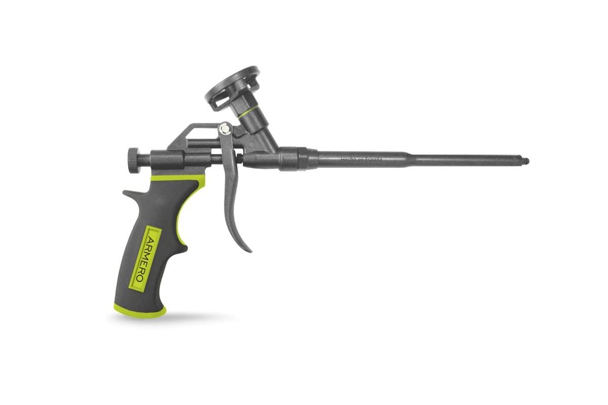 Пистолет для монтажной пены,полностью покрыт тефлоном: канал ствола, запирающая игла и адаптор покрыты тефлоном, тефлоновый шариковый клапан, корпус, двухкомпонентная рукоятка