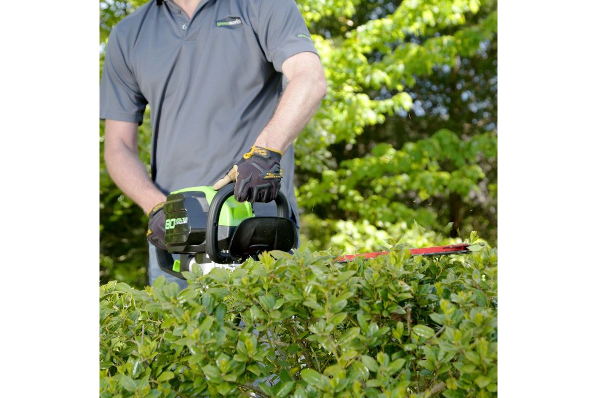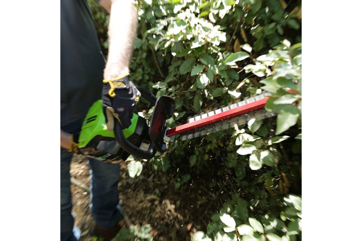 Кусторез аккумуляторный Greenworks из линейки техники 80 вольт (модель GD80HT) - это отличная замена электро или бензокусторезу, которая с легкостью справиться с подрезкой деревьев, кустарника или живой изгороди.