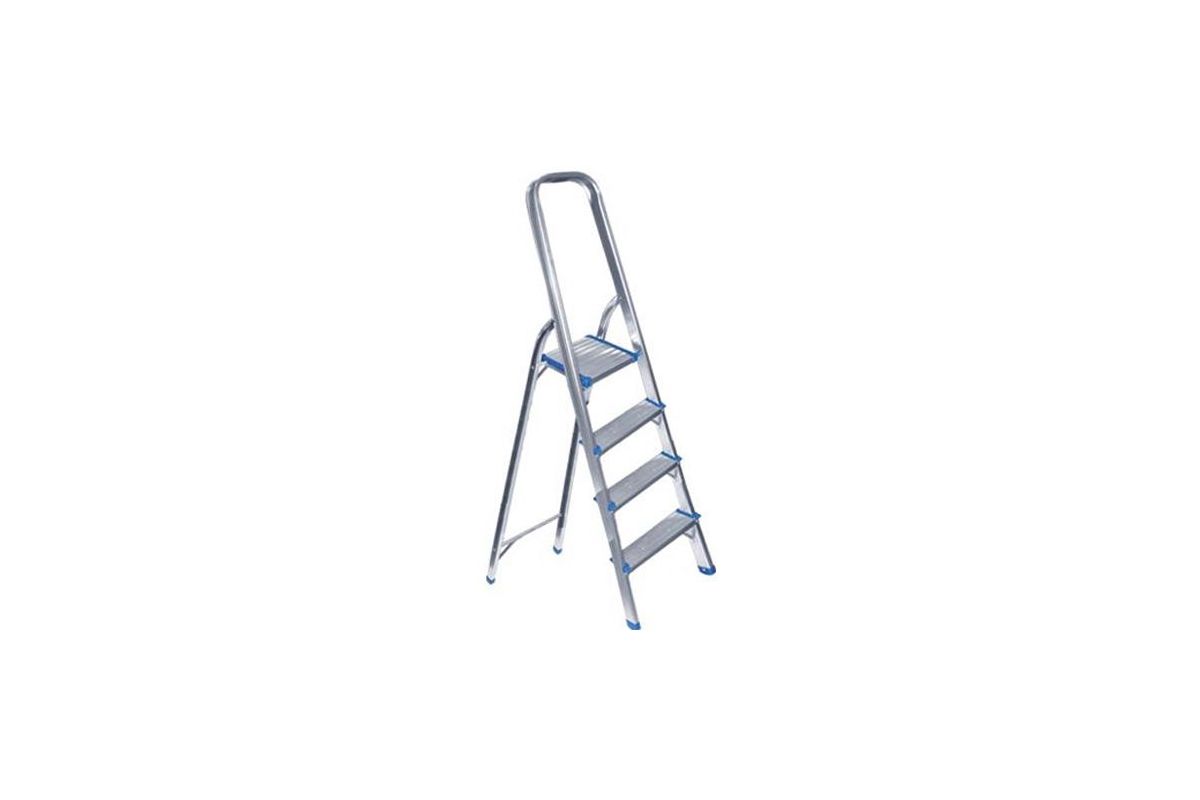 Стремянка алюминиевая — 4 ступени. Лёгкая и прочная: широкая стальная платформа— алюминиевый профиль—широкие алюминиевые ступени с рифленой антискользящей поверхностью.