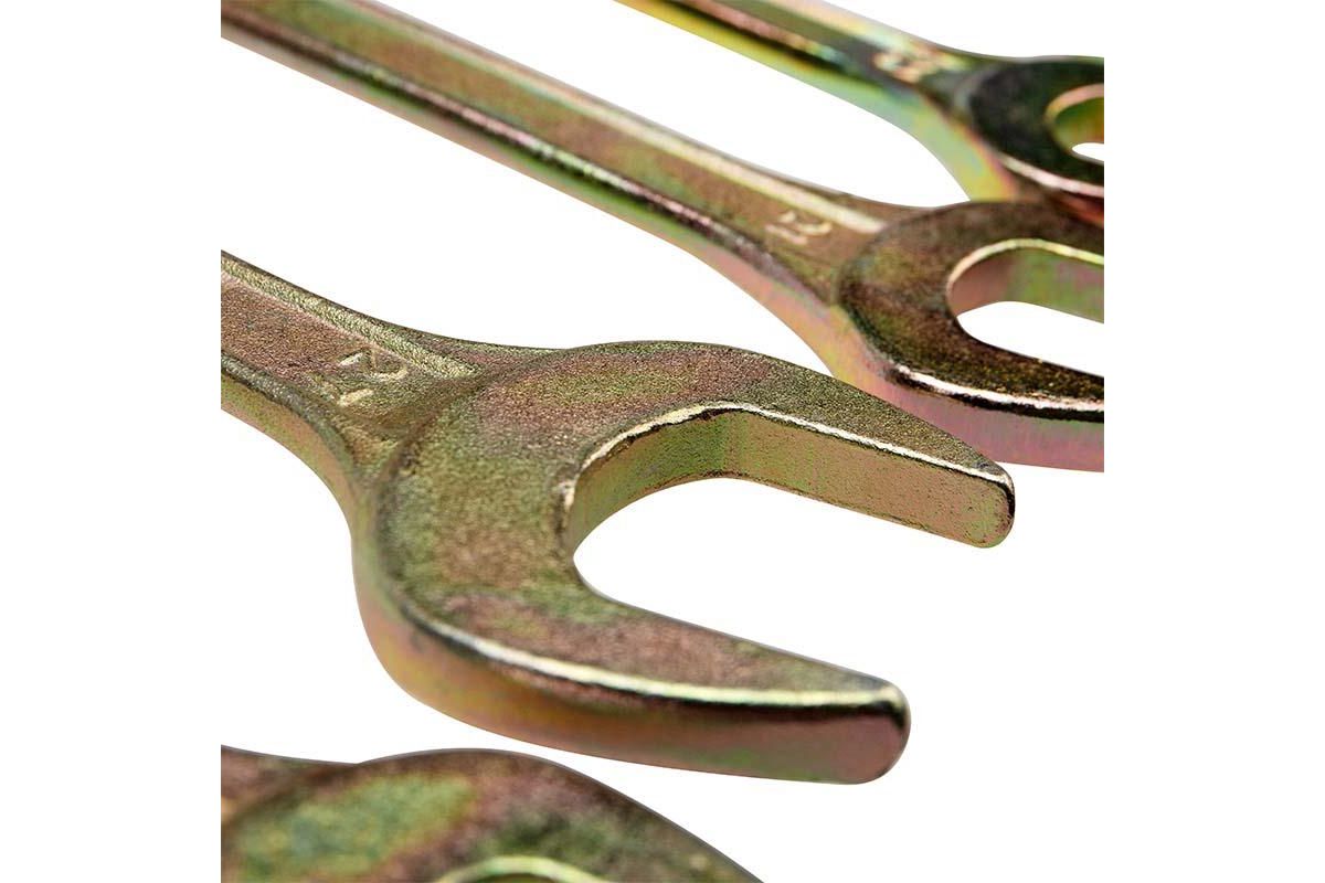 Набор ключей рожковых гаечных предназначен для монтажа и демонтажа резьбовых соединений. С обеих сторон ключа расположен захват открытого типа. Ключи изготовлены из высококачественной хромованадиевой стали (Cr-V). Хром-ванадиевый сплав (Chrome Vanadium) CrV, из которого изготовлен инструмент, обладает такими свойствами, как прочность, жесткость и устойчивость к износу. Во время прокаливания он менее подвержен деформациям и потере первоначальной формы, чем другие типы инструментальной стали.