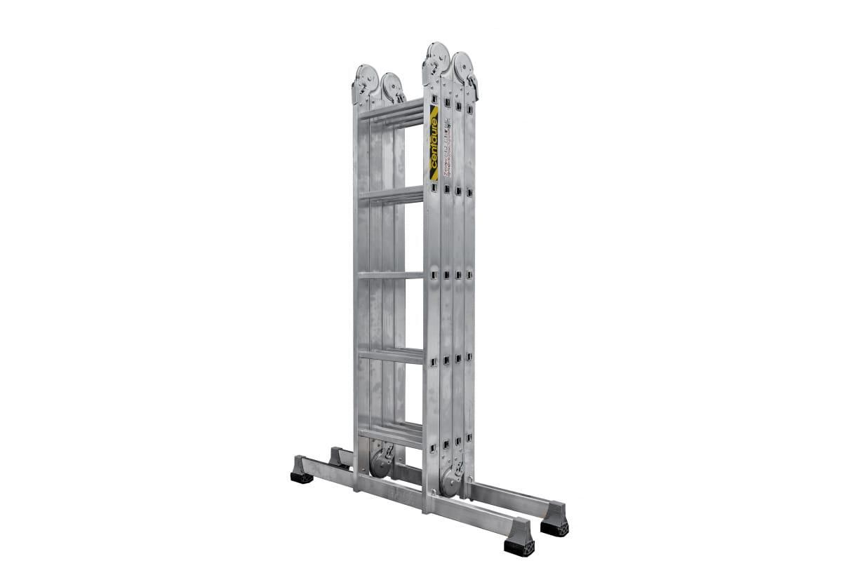 Шарнирная лестница-трансформер изготовлена в виде шарнирной конструкции, соединяющей четыре секции. Подходит для бытового использования. Качественный профиль позволяет ей выдерживать нагрузку до 150 кг. Модель можно использовать в качестве стремянки, подмости, приставной лестницы с Г-образным упором, односекционной приставной лестницы. Два стабилизатора и антискользящие пластиковые наконечники не дают лестнице смещаться.